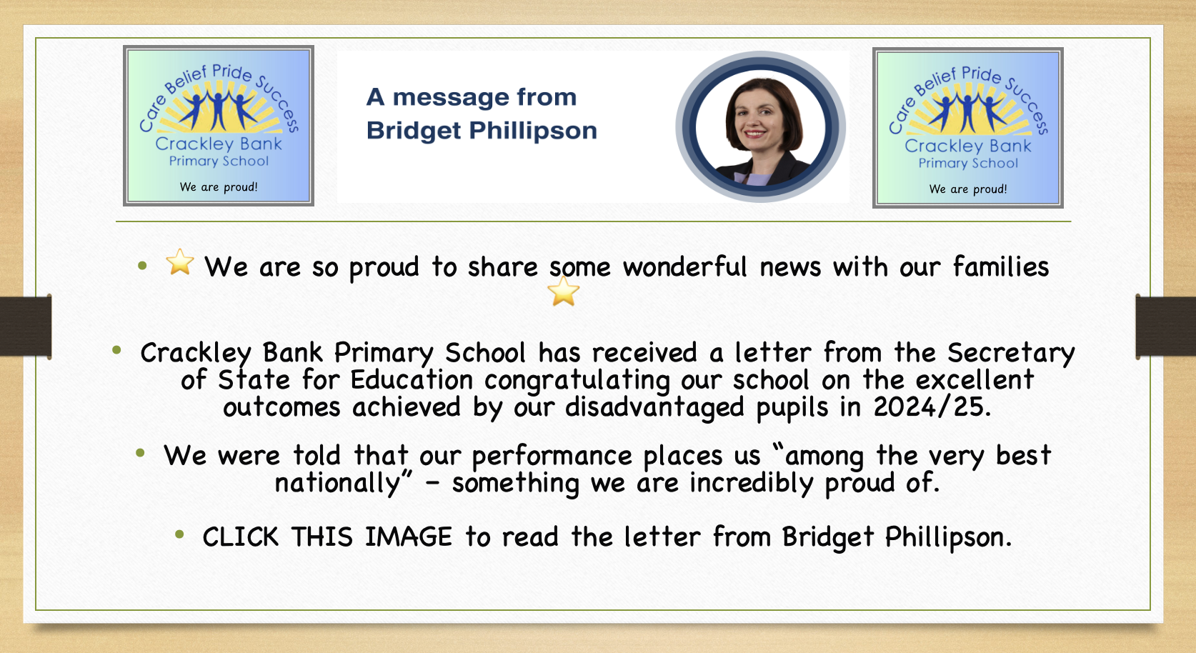 I am always grateful for the level of teaching my children have been provided by Crackley Bank Primary. It is imperative that I extend my gratitude at this time to you, for always keeping me informed and to your staff who always make me feel so welcome when I visit the school - I always feel that I’m valued as a parent and I honestly cannot thank you all enough.