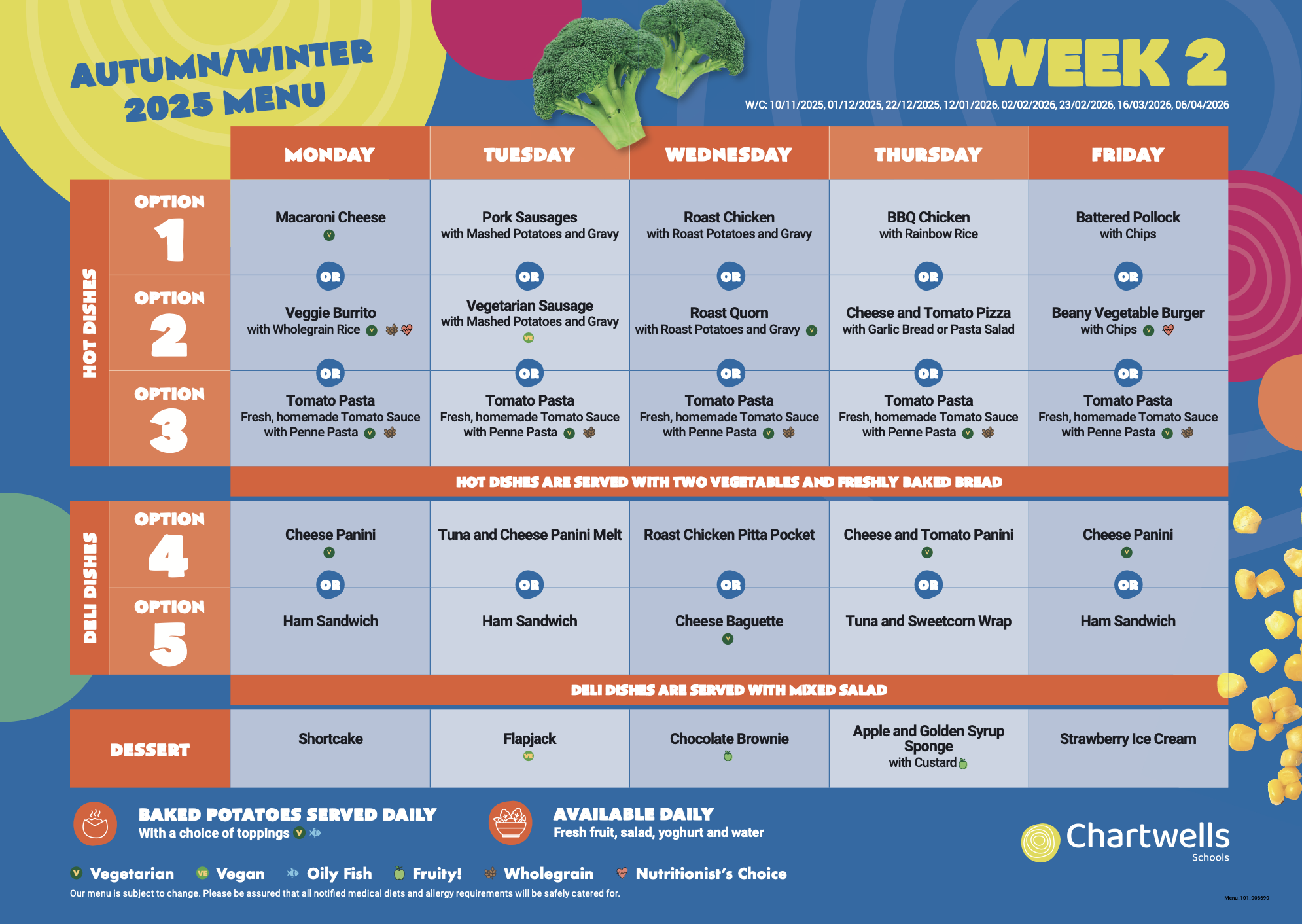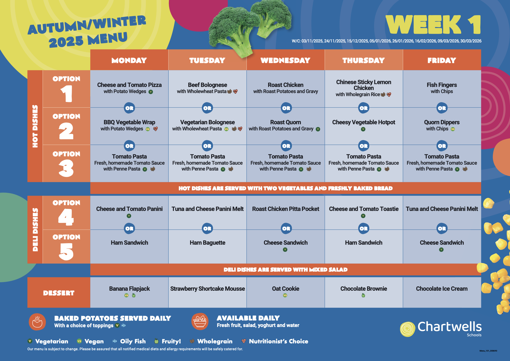 Your child will choose their lunch each morning, the dates for each week are on the Menus above, but also below - just look for the date this week and you will be able to see which week it is.Â
